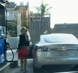 【動画】女さん、「テスラモデルS」でガソリンスタンドに来てしまうw